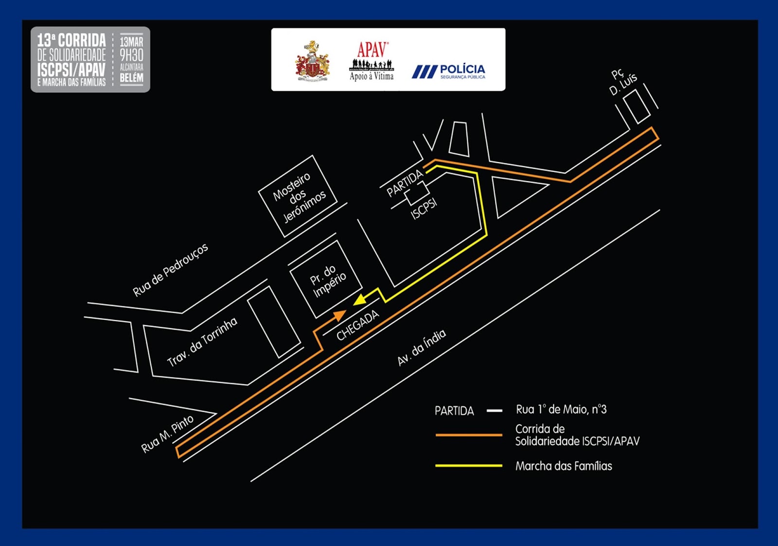 - “Marcha das famílias” – (3, 5 Km) Inicia em simultâneo com a prova anterior, segue pela Rua de Cascais, Avª da índia em direção à Praça do Império, onde está instalada a Meta.